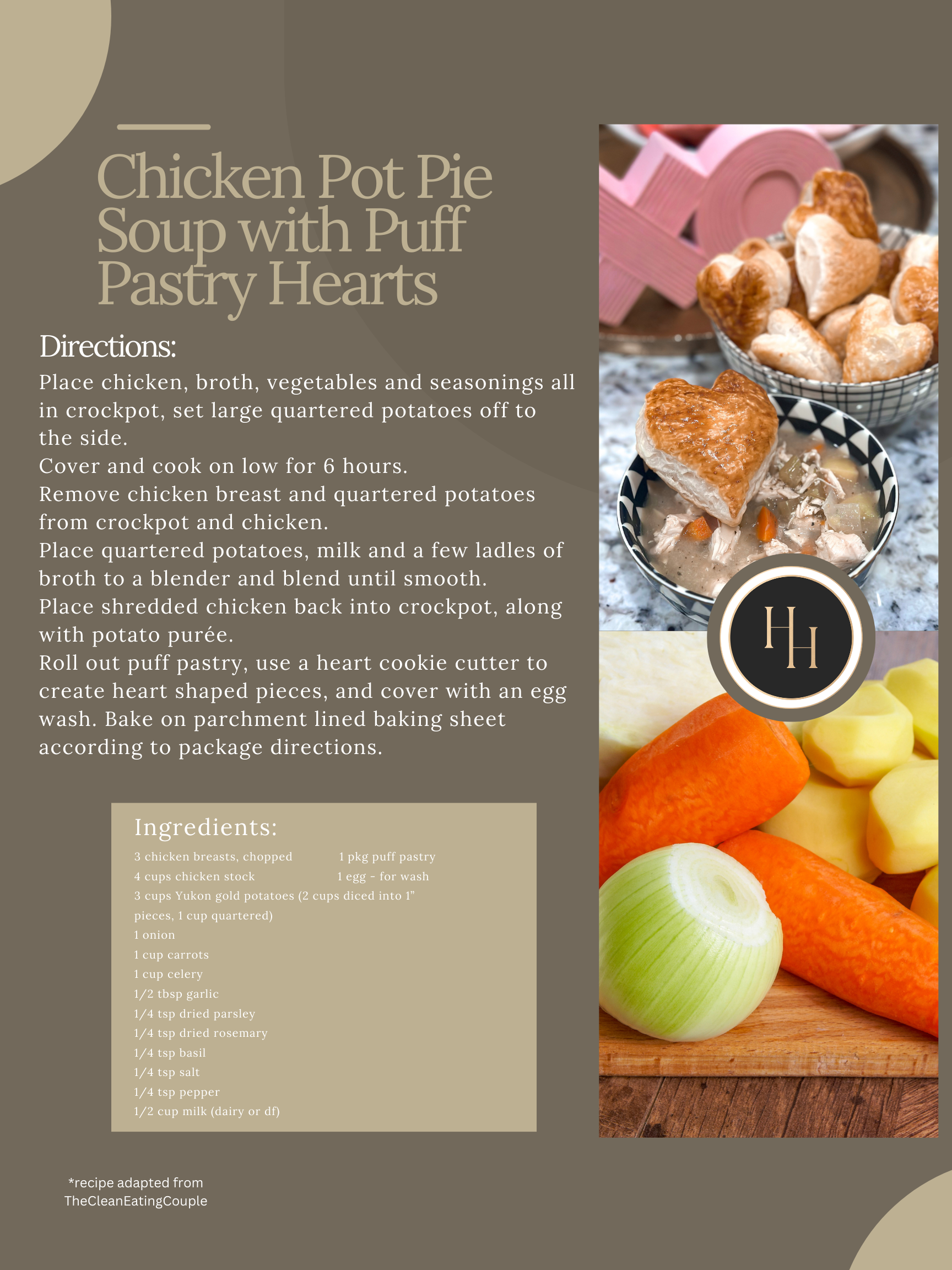 Warm, comforting, and packed with flavors – chicken pot pie soup is a classic dish that never fails to satisfy. In this blog post, we're putting a healthy twist on the traditional recipe by using potatoes to create a creamy base for the soup. Additionally, we'll add a touch of love with puff pastry hearts that not only make the dish visually appealing but also add a delightful crunch. Let's dive into the details of this delicious and nutritious rendition of chicken pot pie soup.
